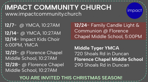 (Most Sundays) Middle Tyger YMCA (720 Shoals Road, Duncan, SC)